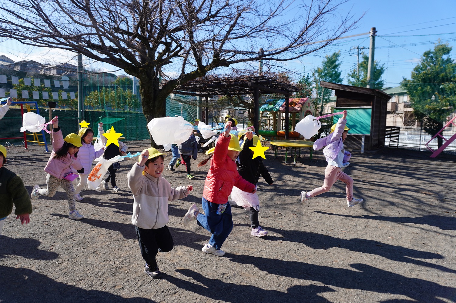 くまグループ(4歳児)です! 年末年始の休みが明け、元気いっぱいに登園した子供たち。 今回はビニール袋を使用して手作りの凧を作りました! ビニール袋に好きなイラストを描き、いざ園庭で凧あげ! 高く上げるためにはどうすれば […]