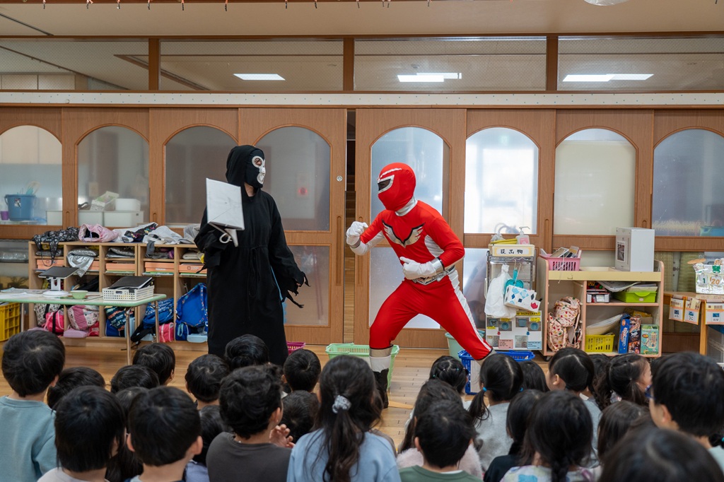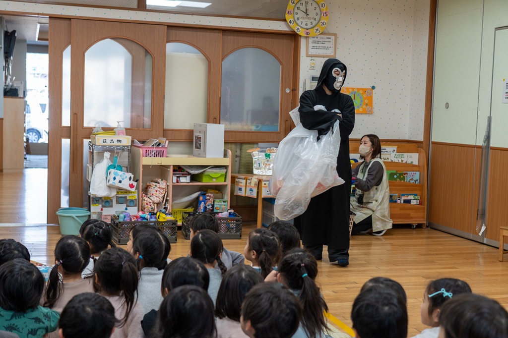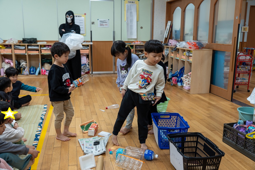 園にごみ怪人がやってきて部屋中ごみだらけになってしまいました。部屋をきれいにするため、子供たちはごみの分別に挑戦しました。