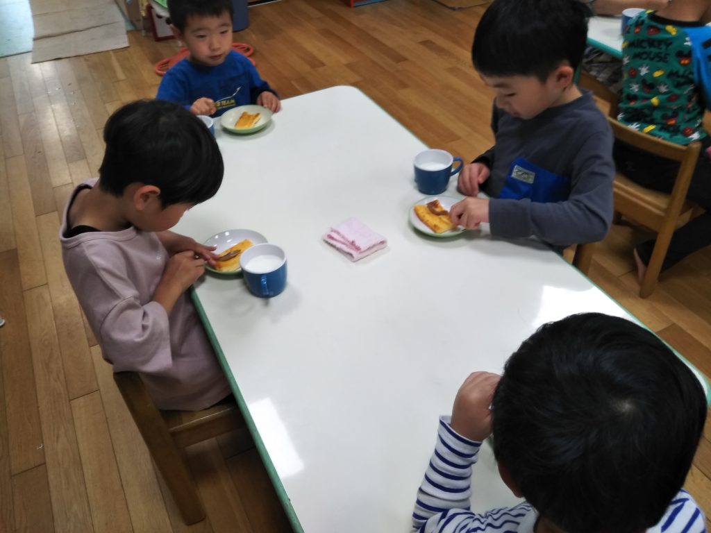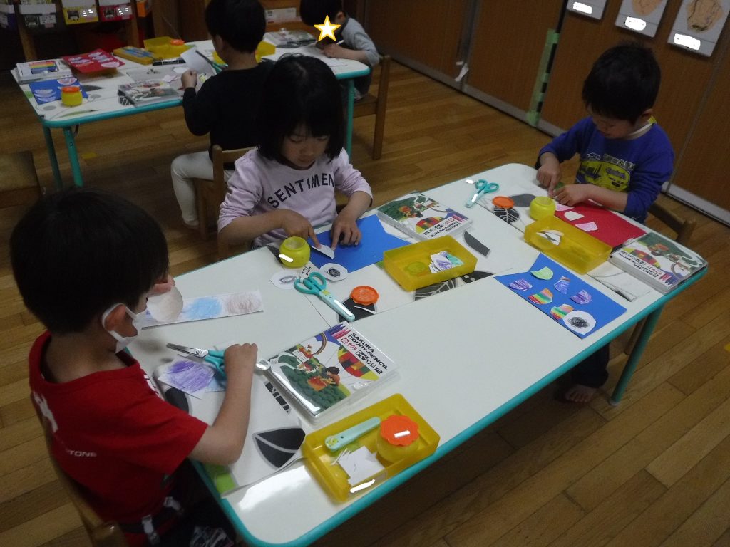 5月5日の子供の日に向けて、こいのぼり製作を行ないました。円形の画用紙にクーピーで好きな色を塗り、それを半分に切ってウロコに見立てました。「虹色にしたいな」「端っこまで塗れたよ」と子供同士で話したり、自分でウロコをどう配置するか考えたりしながら素敵なこいのぼりを作ることが出来ました。