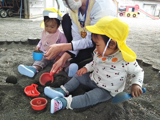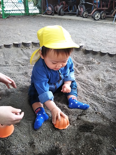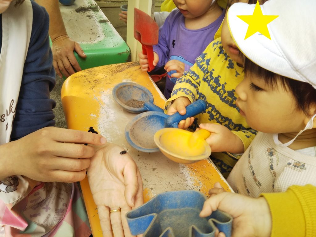 砂がさらさらと落ちる様子を見たり、実際に落としてみたり、保育教諭が作った形を崩して遊んだりとそれぞれ好きな遊び方を見つけ、熱中している様子でした☆彡