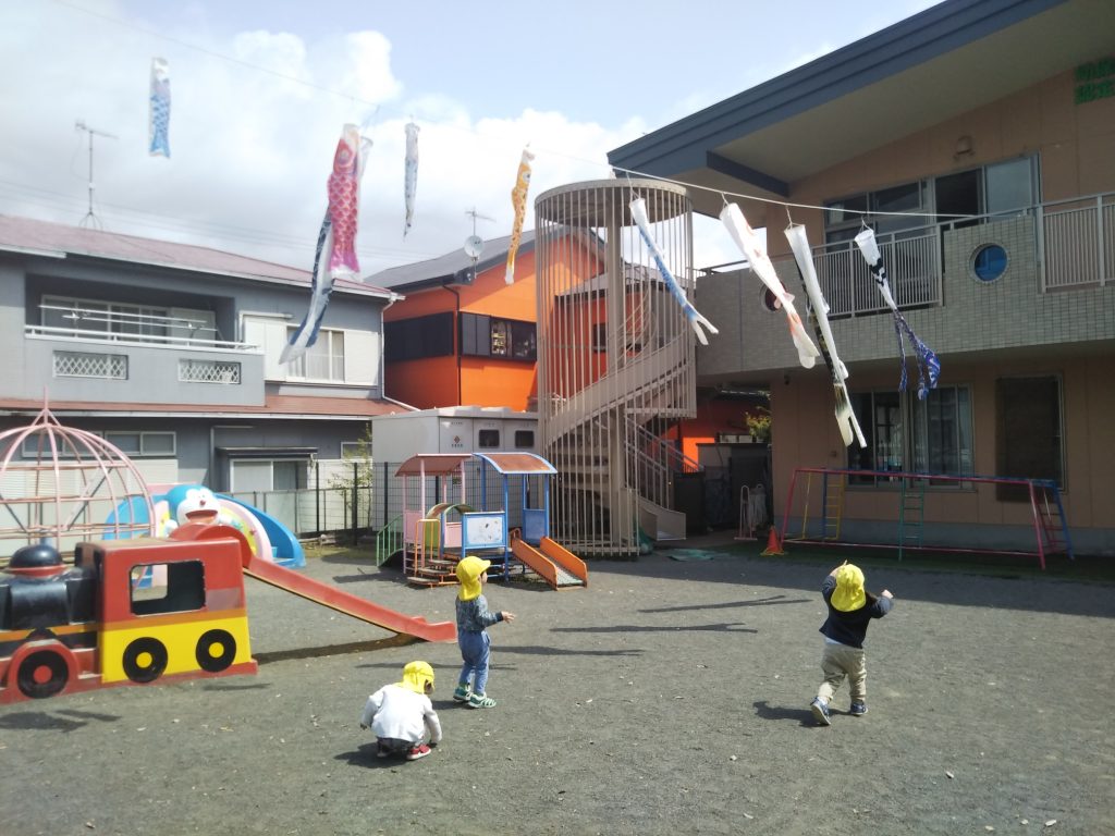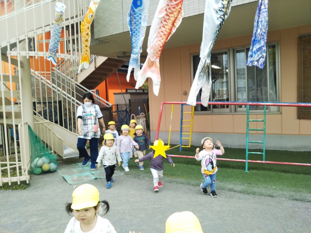 靴や靴下を自分で履いて元気に園庭に出ると、気持ちよさそうに泳ぐこいのぼり発見!