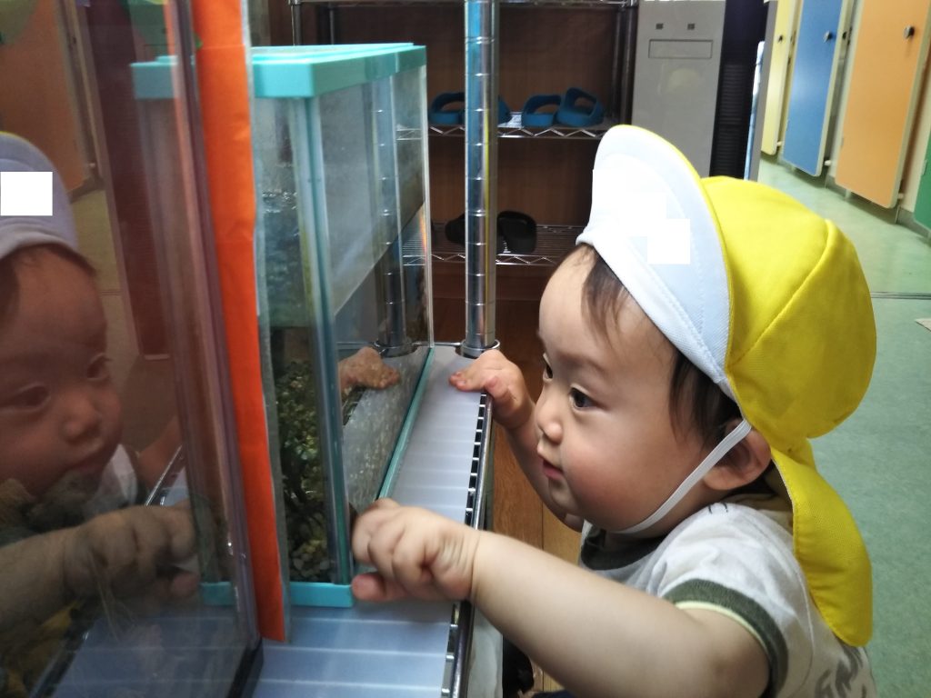 食い入るように見る子や動いているメダカを目で追ったり、喃語を発しアピールをしたりと姿は様々でした。