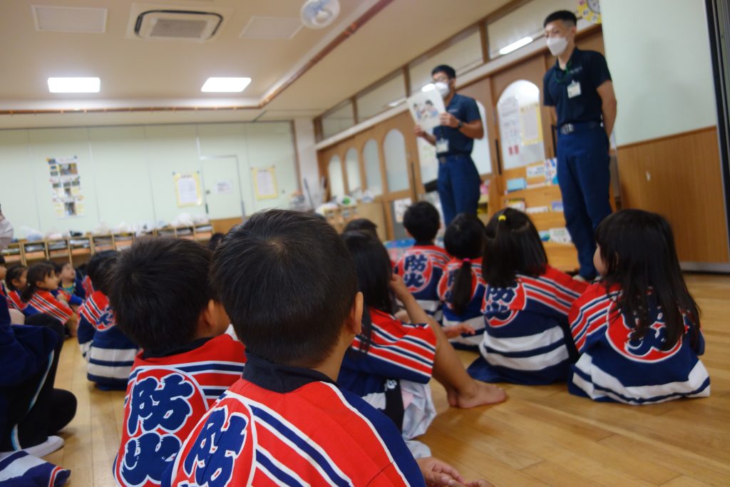 火事が起きてしまった時に来る車は?などの問いに元気よく答えたり、火事が起きないために自分たちは何ができるのか、火事をみつけたらどうしたらよいかを学んだりしました。
