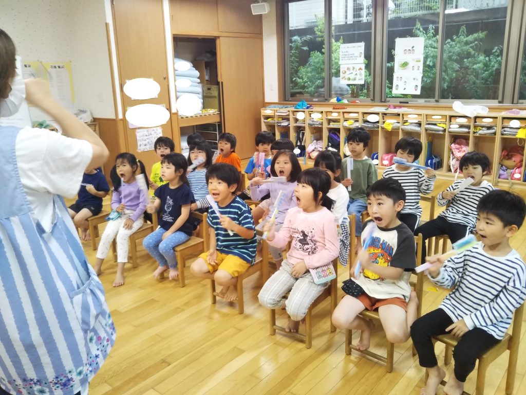 先日、虫歯予防デーの集会に参加し、パネルシアターや紙芝居を見たり自分で作った歯ブラシの模型を使用したりしながら歯磨きの大切さや歯ブラシの正しい持ち方、磨き方を学びました。