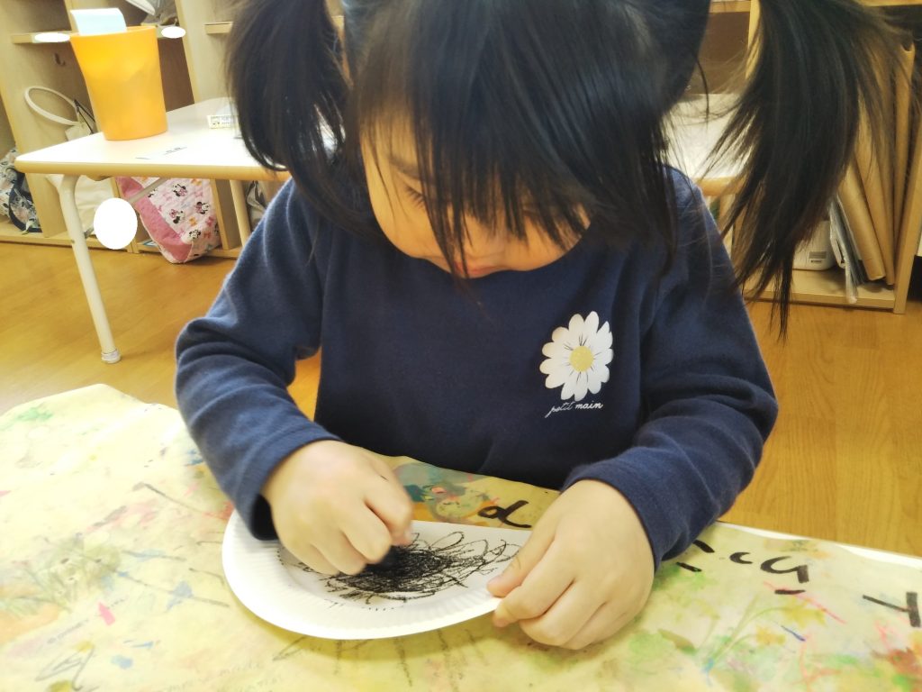 次に半分に切った紙皿を黒いクレヨンでぬりぬり