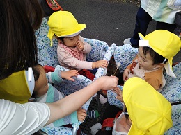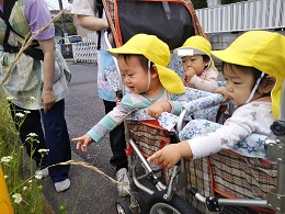 道中に綿毛を実際に触ってみるとふわふわとした感触!最後に綿毛を保育教諭が飛ばすと、風に乗って飛んでいく綿毛を一生懸命目で追い、“ばいばい”と手を振る子もいました。お気に入りが見つかって良かったですね♪