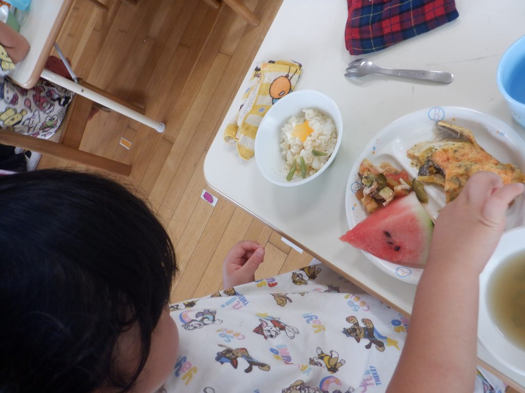 毎月、誕生会が行なわれる日は「わくわくドキドキ給食」の日です。特別なメニューのお昼とおやつがでるため、朝から献立を確認しに行く子供たちの姿も多く見られます。また、普段は14時に降園する子供たちも、わくドキの日は“おやつ”を食べてから帰ります。わくドキの日も、7月で今年度4回目です。