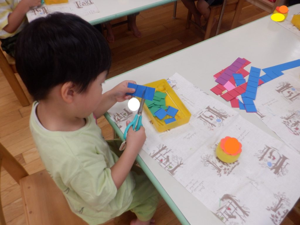 はさみを使用することを保育教諭から聞くと「早く使ってみたい」「お家でもやったことあるよ」などと意欲的に参加しようとする子供たちの姿が見られました。