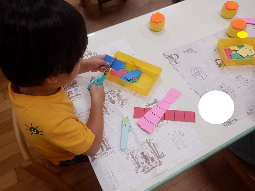 ぱんだグループ(3歳児)では、先日はじめてはさみを使って製作を行ないました。