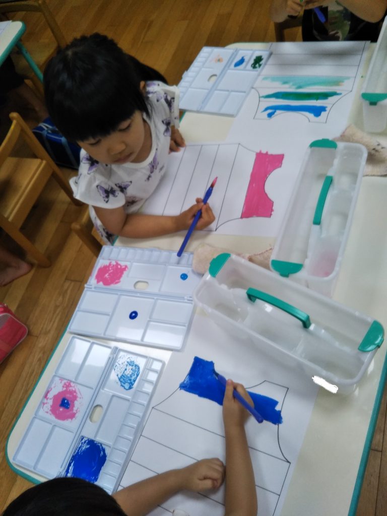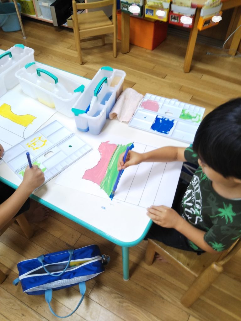 4歳児のくまグループから、個人の絵の具セットを使用するようになります。
