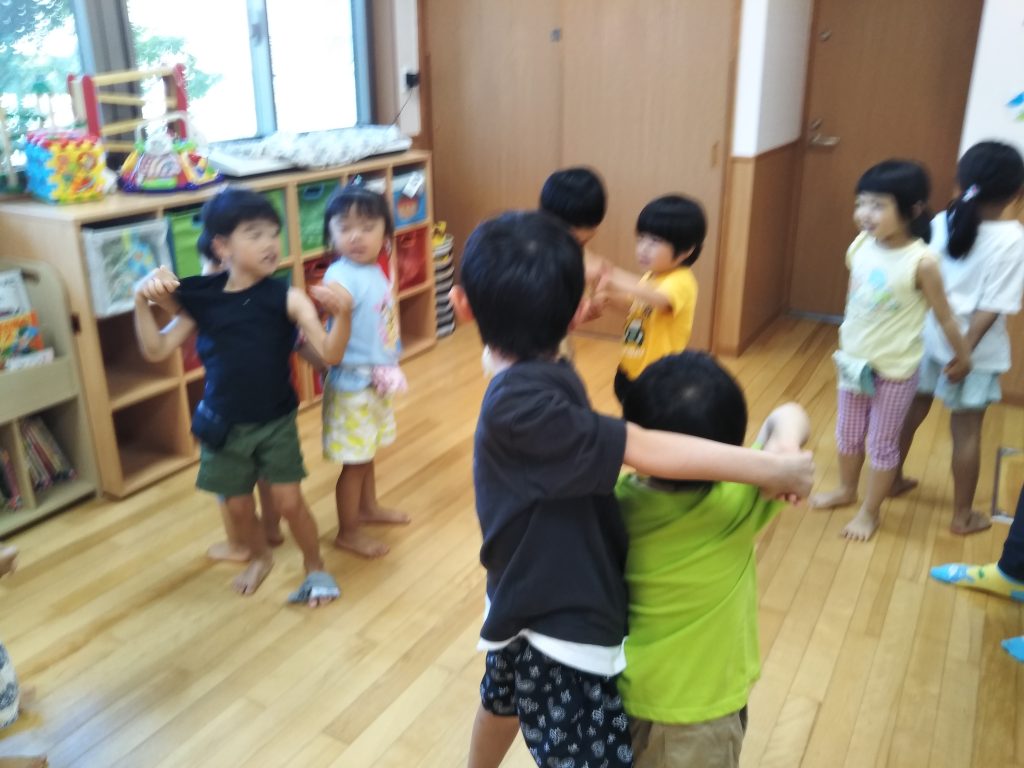 「あめこんこん、ふるなよ~」の歌に合わせて、目隠ししている子の周りにみんなで円を作り、グルグル回ります。歌が終わった時に、目隠ししている子の後ろにいる子が動物の鳴きまねをします。目隠ししている子が、動物の鳴きまねをした子が誰かをあてる遊びです。