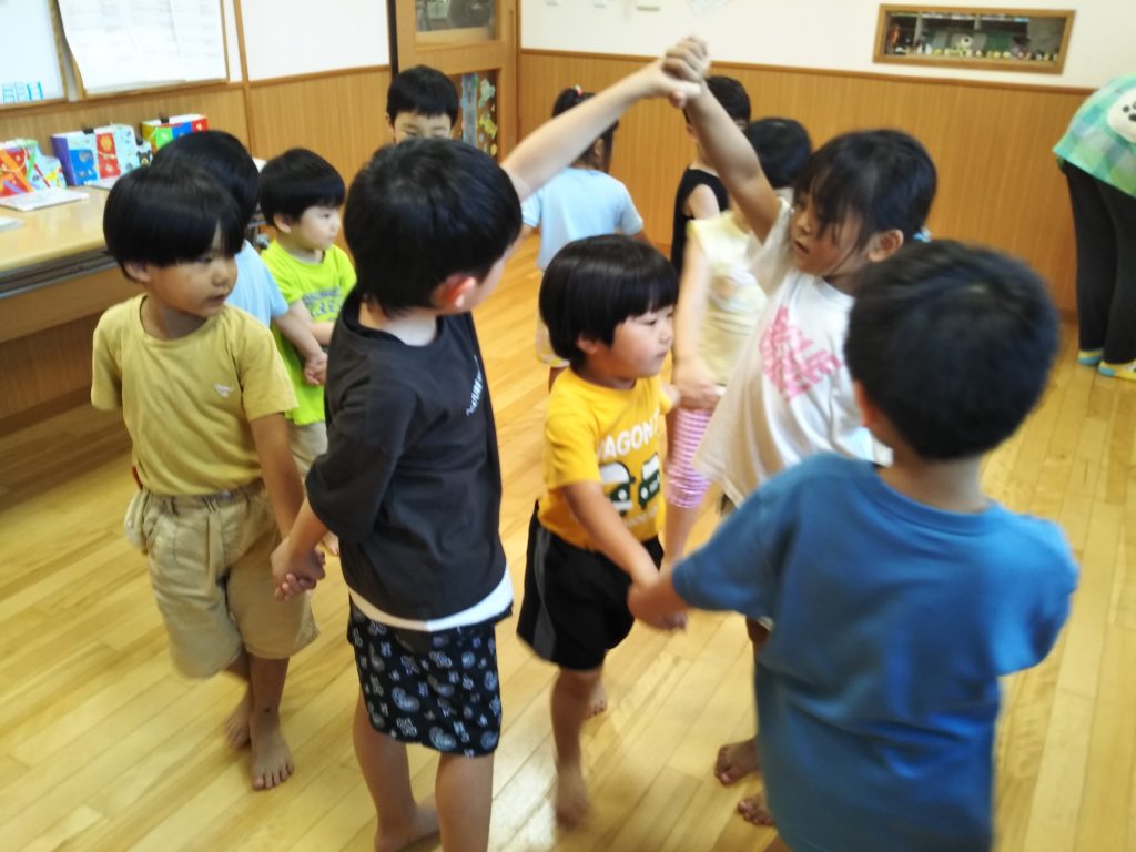 まずは、なべなべそこぬけをチャレンジ!2人組から少しづつ人数を増やして挑戦していき…