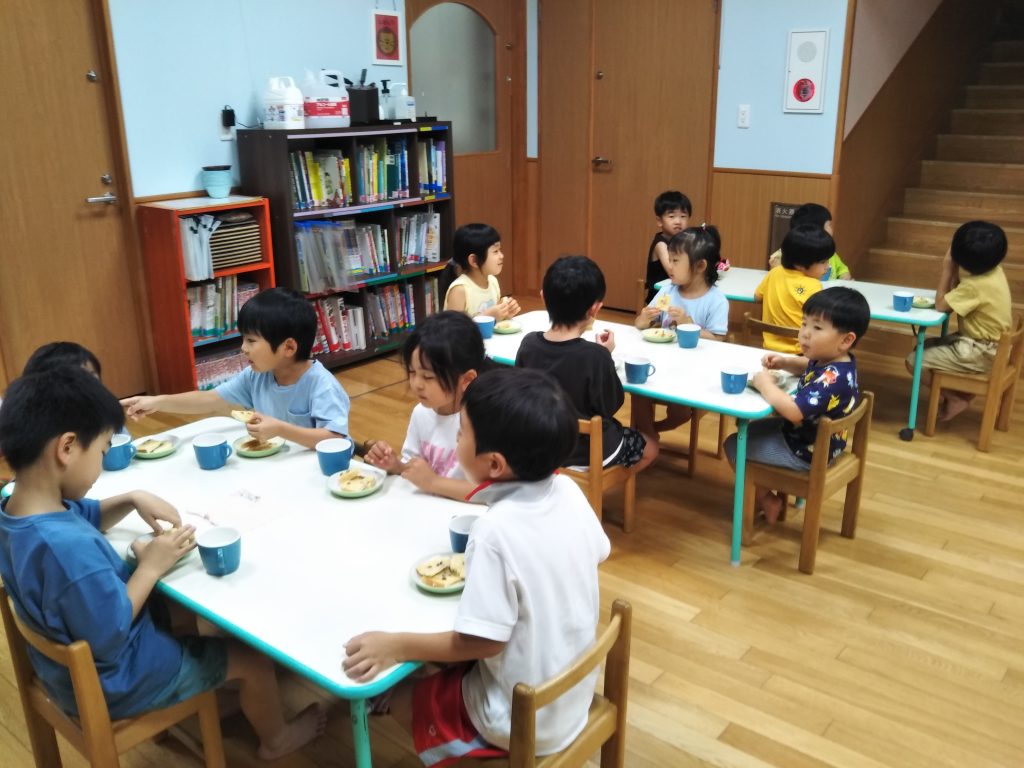 他にも、ひねりゴマやけん玉に挑戦したり、「たけのこいっぽん」という遊びを行なったり、楽しい時間を過ごした後は、お楽しみの、おやつの時間です。