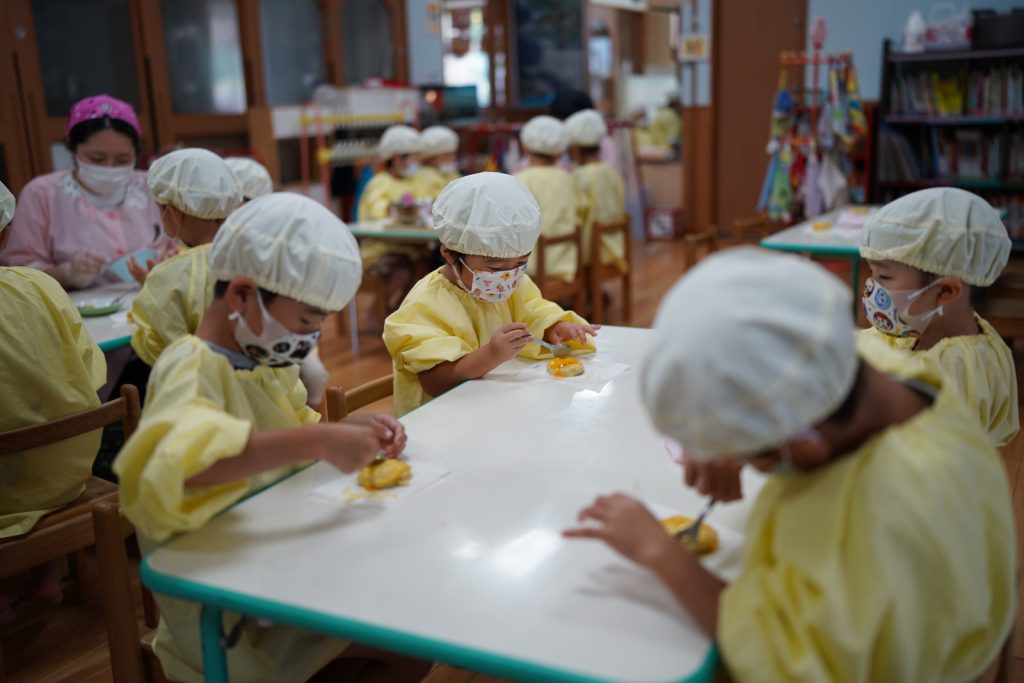 まずはクッキングのお約束を聞いてから、スモックを着用しクッキング用帽子をかぶりました。コロナ禍にクッキングは行なっていなかったため、子供たちのその姿を見るのも久し振りです。
