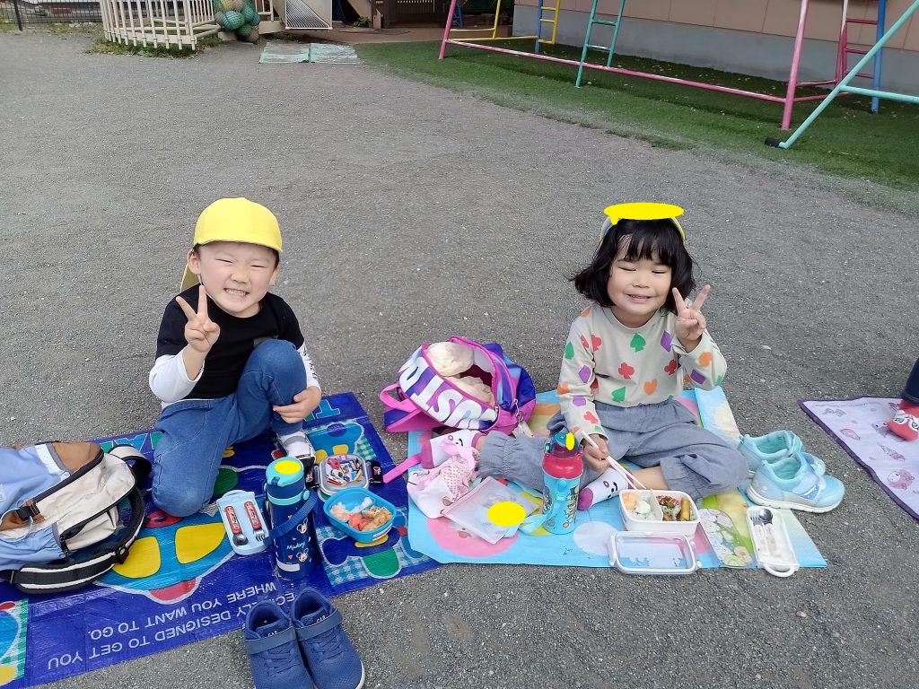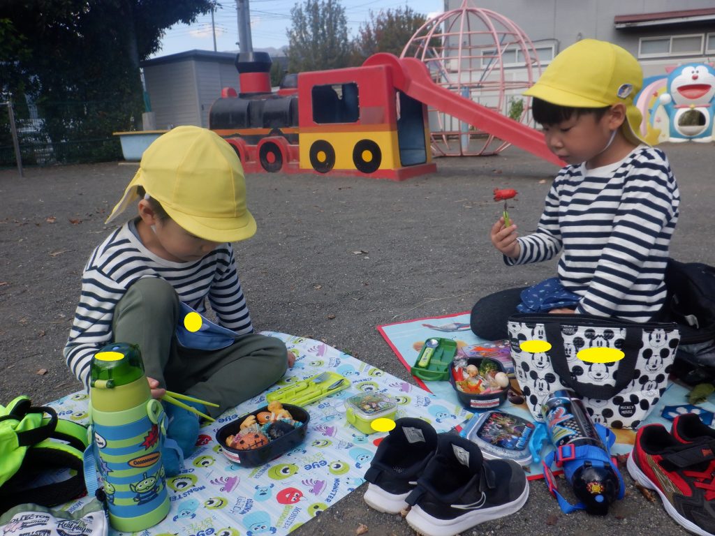 今までは、保育室内でお弁当を食べていましたが、先日初めて外でお弁当を食べました。