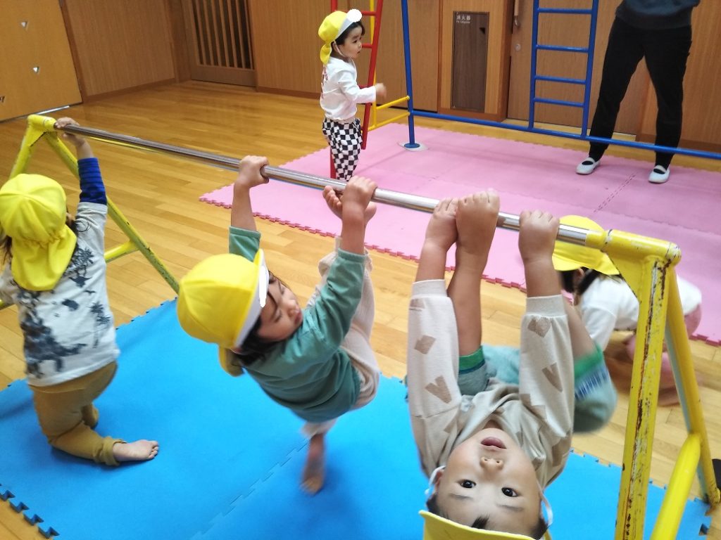 鉄棒では、両手でしっかりとバーを握ってぶら下がったり足抜き回りをしたり、