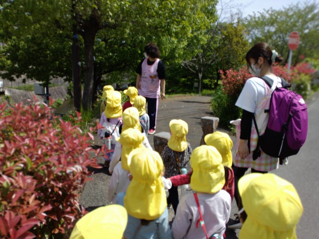 紙芝居を見て、交通ルールを確認してから出発!道の端を歩くこと、横断歩道ではしっかりと安全確認を行なうことなどを意識しながら歩くことができました。道中、草花や乗り物などを見つけると「○○がある!」「こっちには○○もある♪」などとやり取りを楽しみながら歩く姿も見られましたよ☆