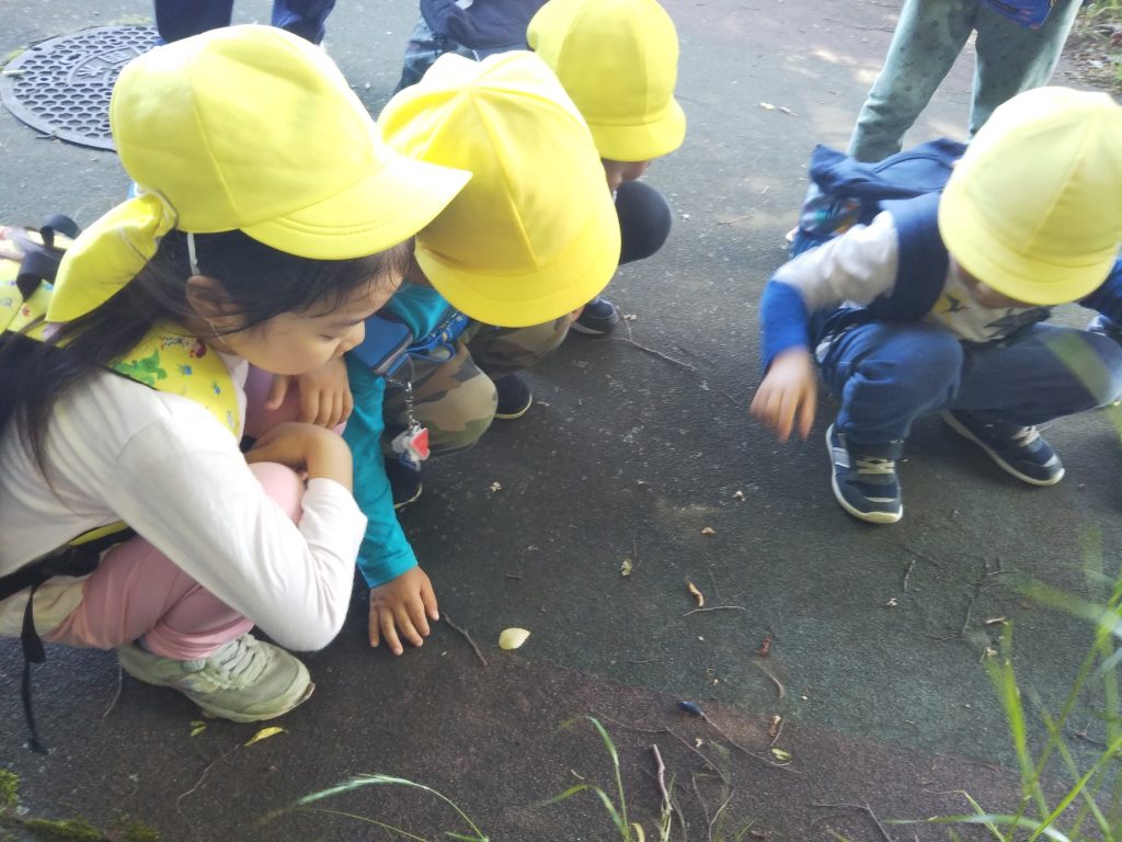 木の実や変わった植物、虫などを見つけると足を止めじーっと観察したり触ってみたり友だちと共有したりと、自然に触れながら楽しく歩くことができました。