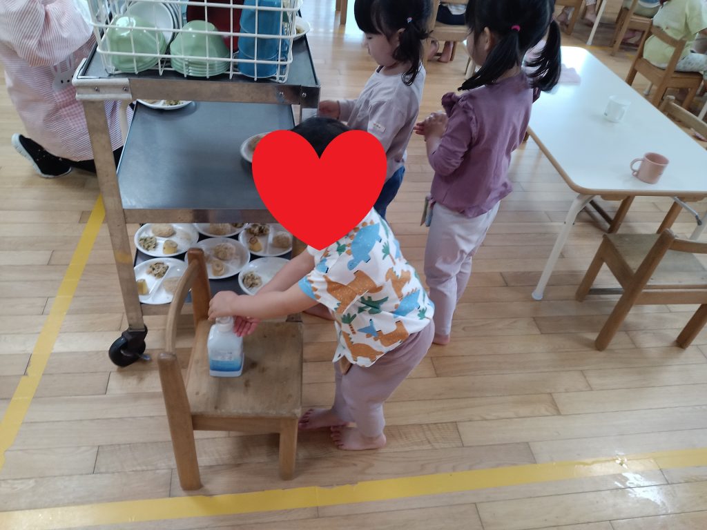 アルコールで消毒をしてから配膳を行ないます!