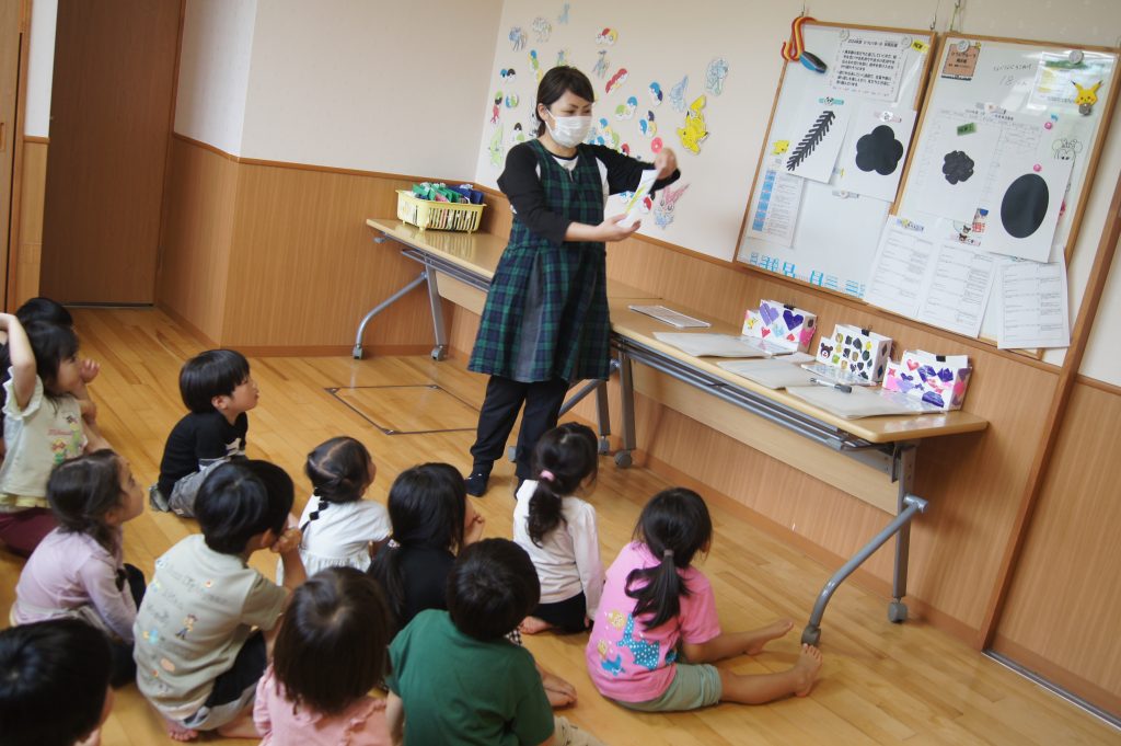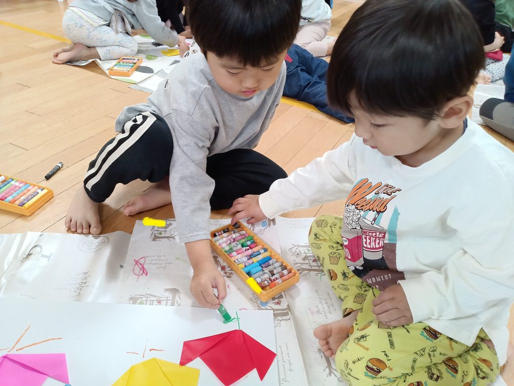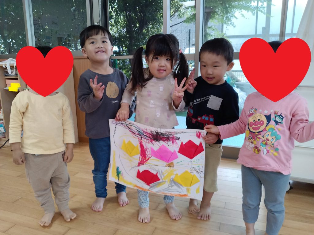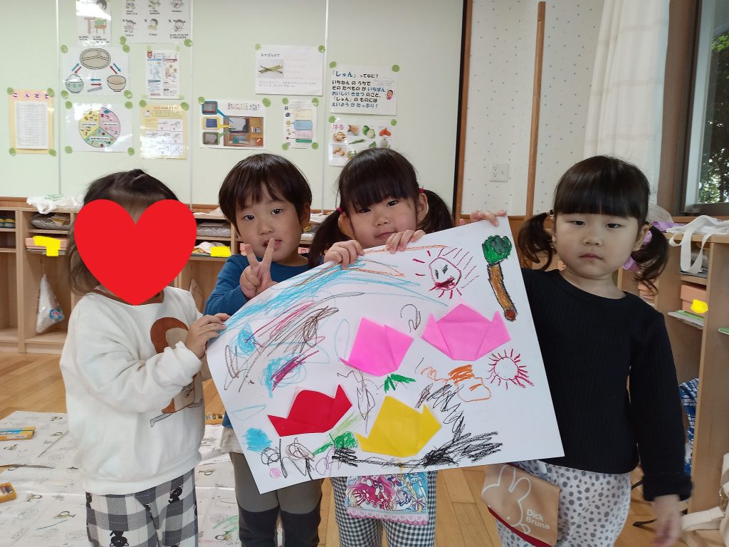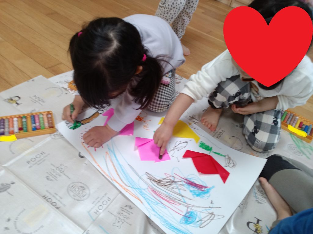 先日、3歳児のぱんだグループは折り紙やクレヨンなどの教材を使用して、共同製作を行ないました。