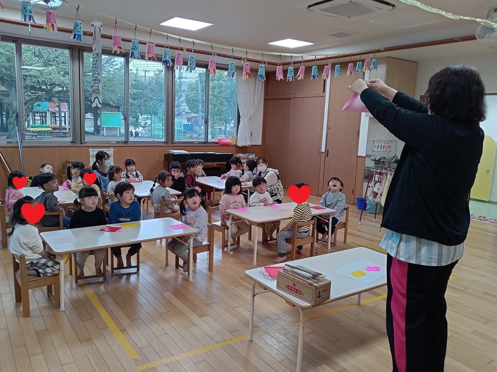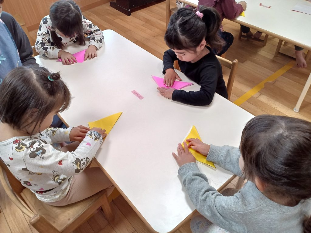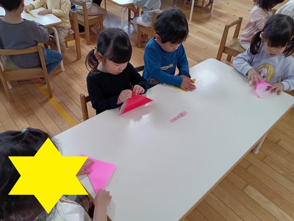 保育教諭の説明や手本を見ることで折り方を確認します(*^-^*)