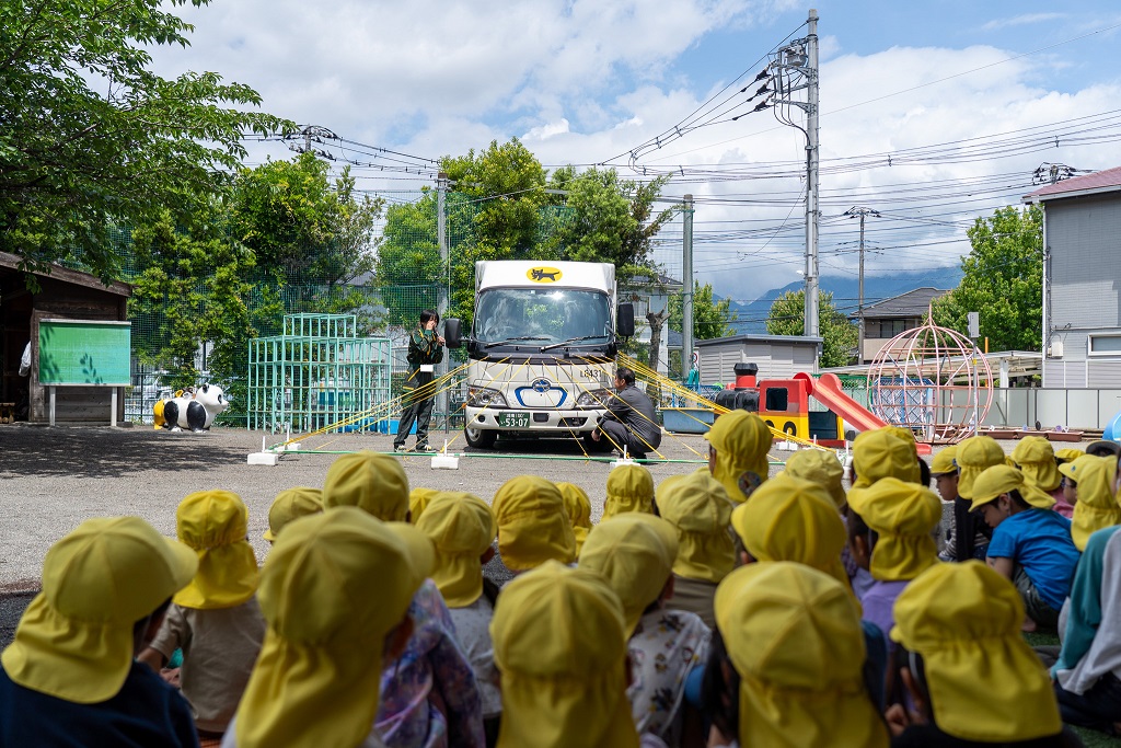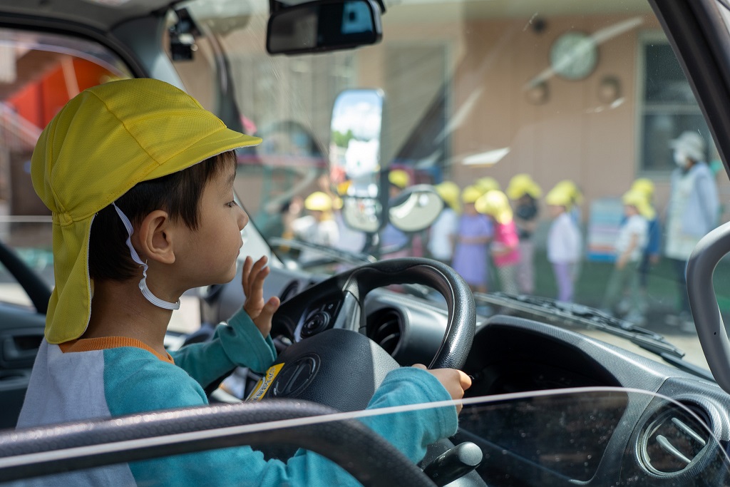 きりんグループの子供たちは運転席に座らせてもらい、実際に運転席からの見え方を確認しました。