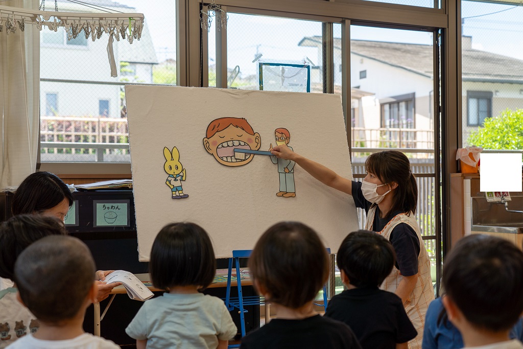 パネルシアターの中で、歯磨きをしない主人公の口の中に“ムッシバン”がやってきたのを見ると、
