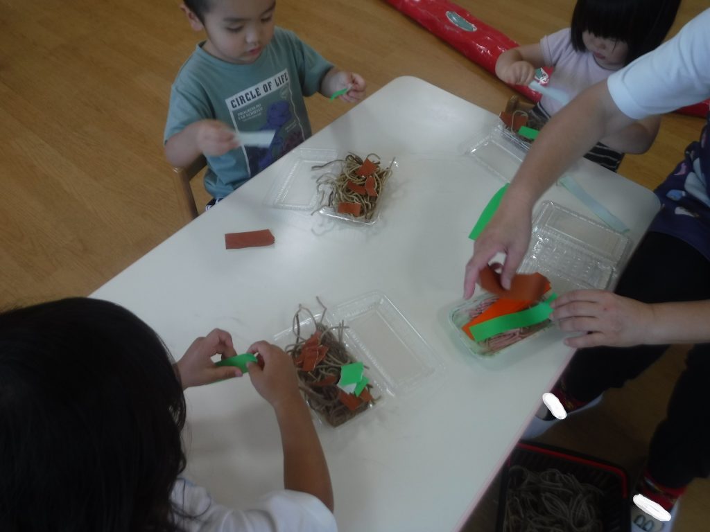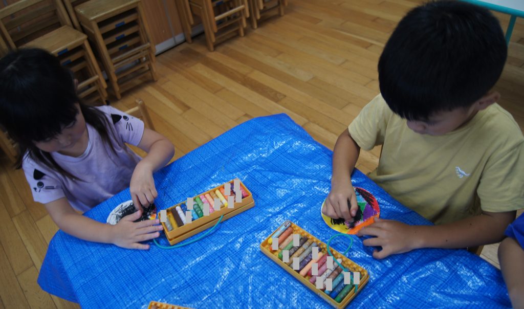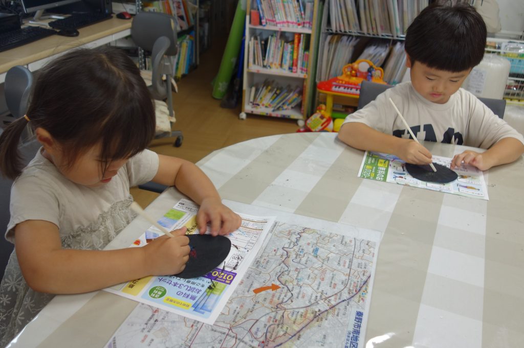 夏の暑い期間は園外に出ることが難しいため、涼しい保育室で秋に行う予定のおまつりごっこに向けて準備中の子供たちです☆
