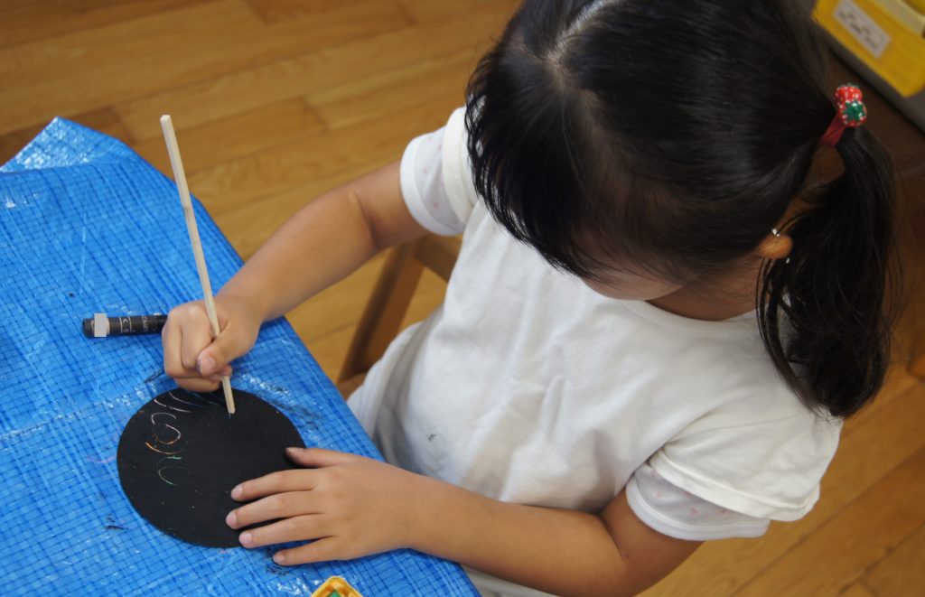 絵の具ほど汚れないので、おうちでも簡単にできるのでおすすめです。