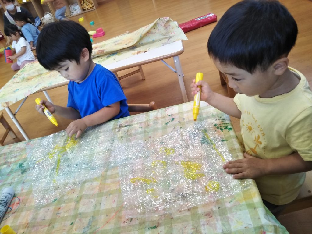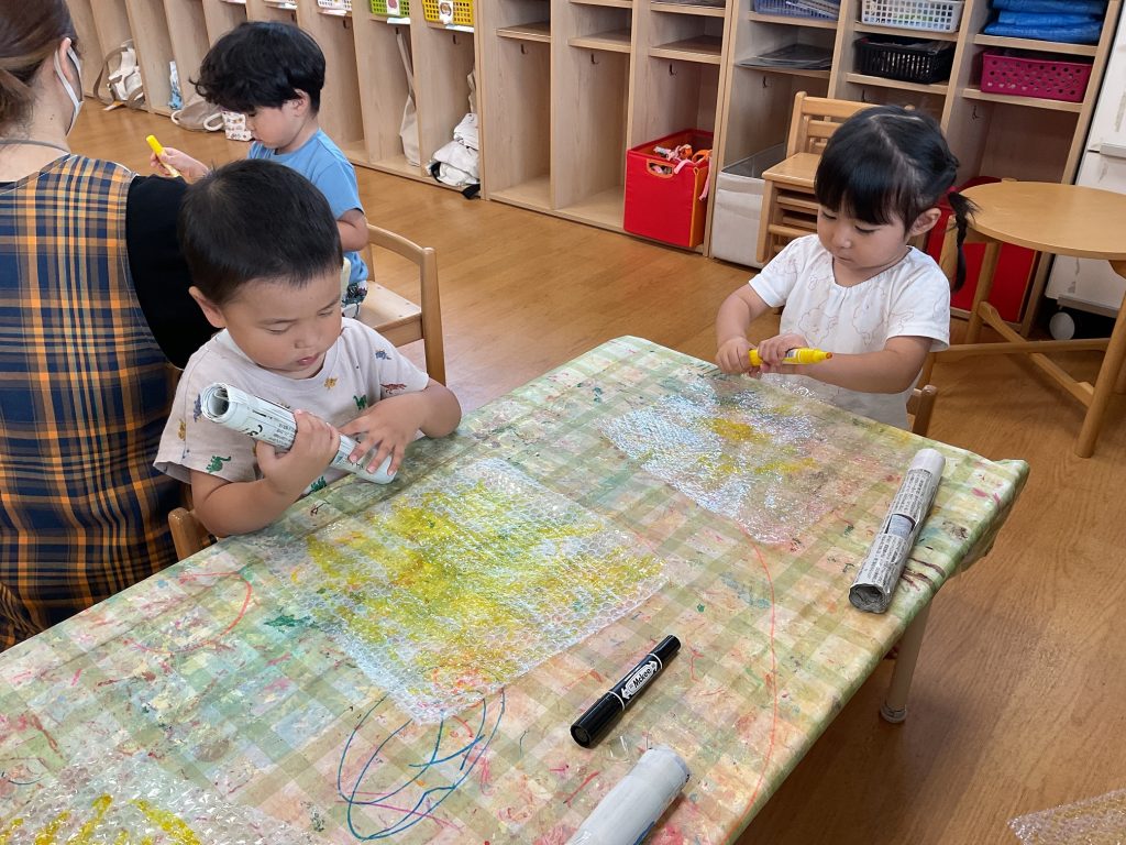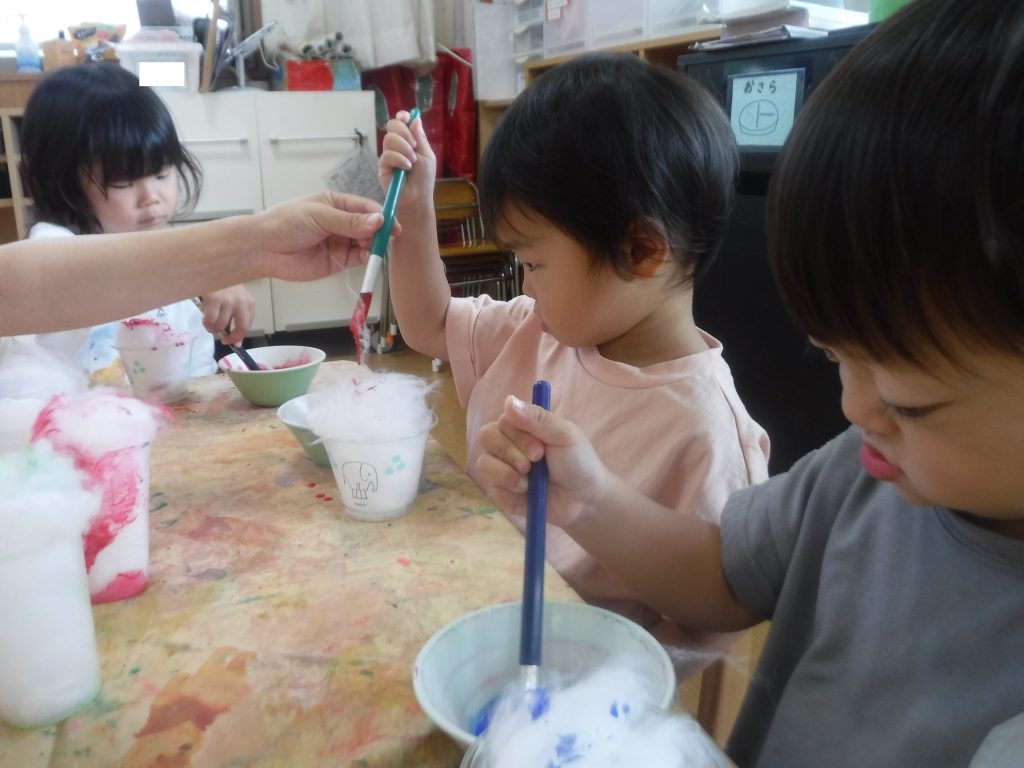 最近の活動では、絵の具を使った製作や水遊びなどを取り入れています。