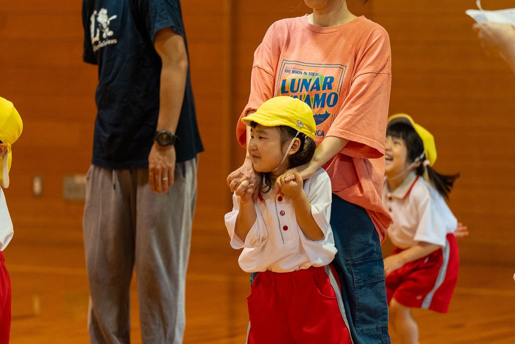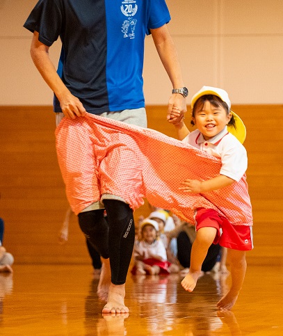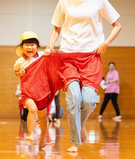 子供たちが保育園で行なっている体操を保護者の方と一緒に行い、身体がほぐれたところで第一種目「デカパン競争」!