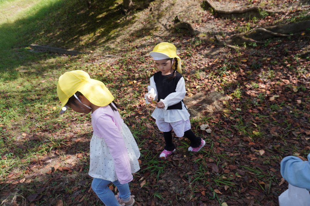 尾尻公園では、製作に使えそうな落ち葉を各々探しています。「こんな形の葉っぱがあったよ」「色んな色の葉っぱがある」など沢山の発見をした子供たち。