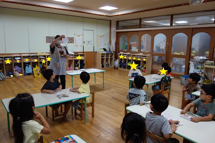 最初に寒色と暖色の色の違いについて学びました。保育教諭が「寒い色って何色?」と質問すると「青!」「紫!」と元気いっぱいに答える子供たち。