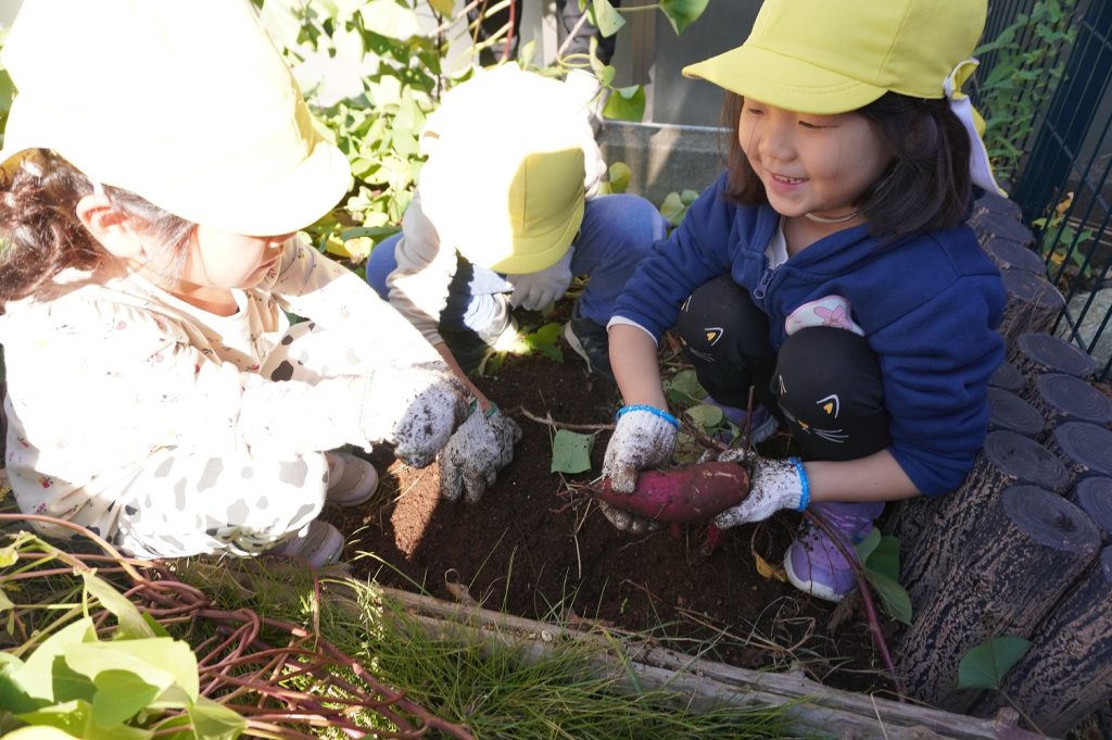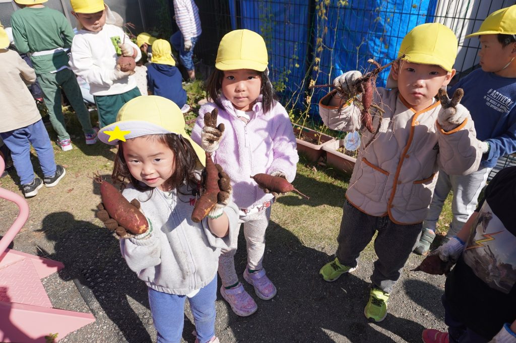 友だちと協力して真剣に掘っていました。さつまいもらしき物を見つけると「あった!さつまいも発見!」と夢中になって掘り、見事収穫することができました♪