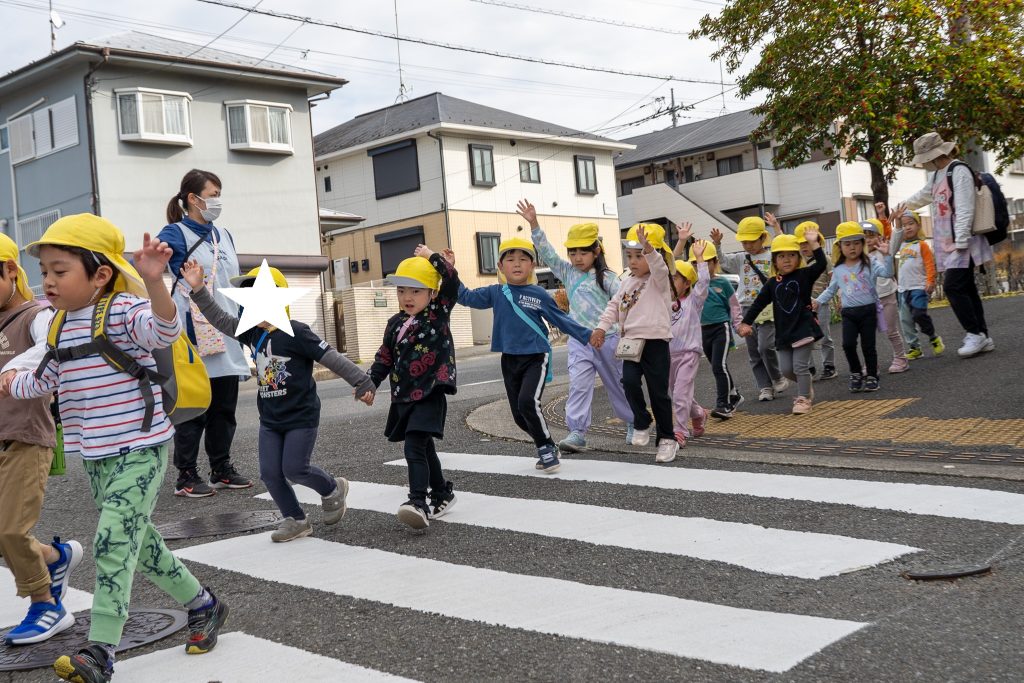 異年齢のペアで手を繋ぎ、年上の子が道路側を歩くなど年下の子を気遣いながら、歩く姿が見られました。