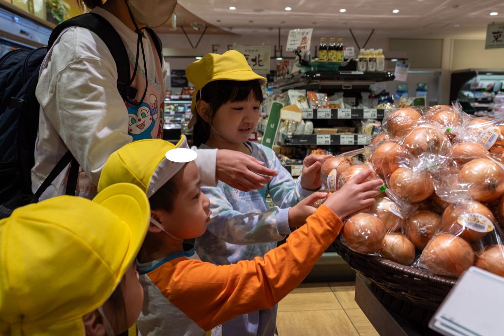 お店には少人数のグループを作り、1組ずつ入店しました。「ジャガイモはお野菜の所にあると思う」など、自分たちのグループが買うものがお店のどこにあるかも考えながら、お目当ての商品の元へ。