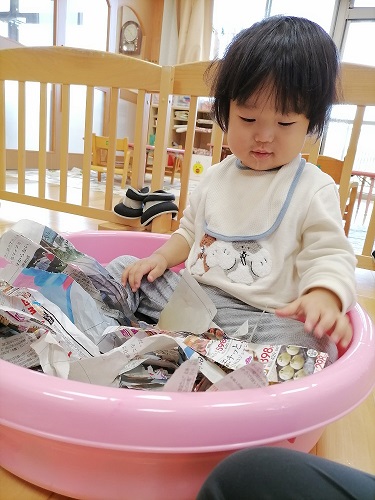 新聞紙を破いたり、丸めたりして雨のように降らせたり、たらいに入れてお風呂のようにして見立て遊びを楽しんでいます♪