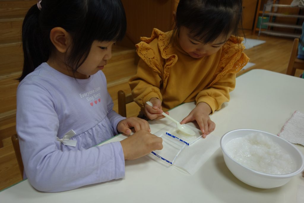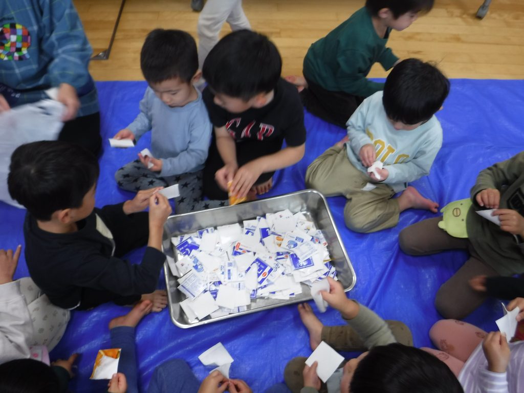 水に浸して、柔らかくなった牛乳パックのツルツルの部分を剥がしています。細かい作業ですが、子供たちの目は真剣です。