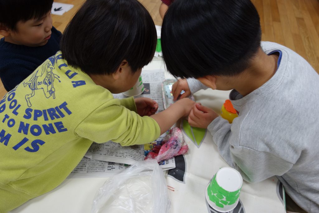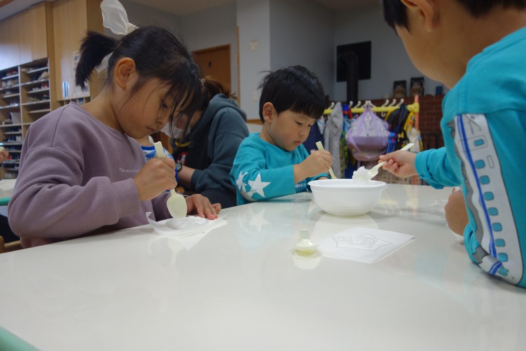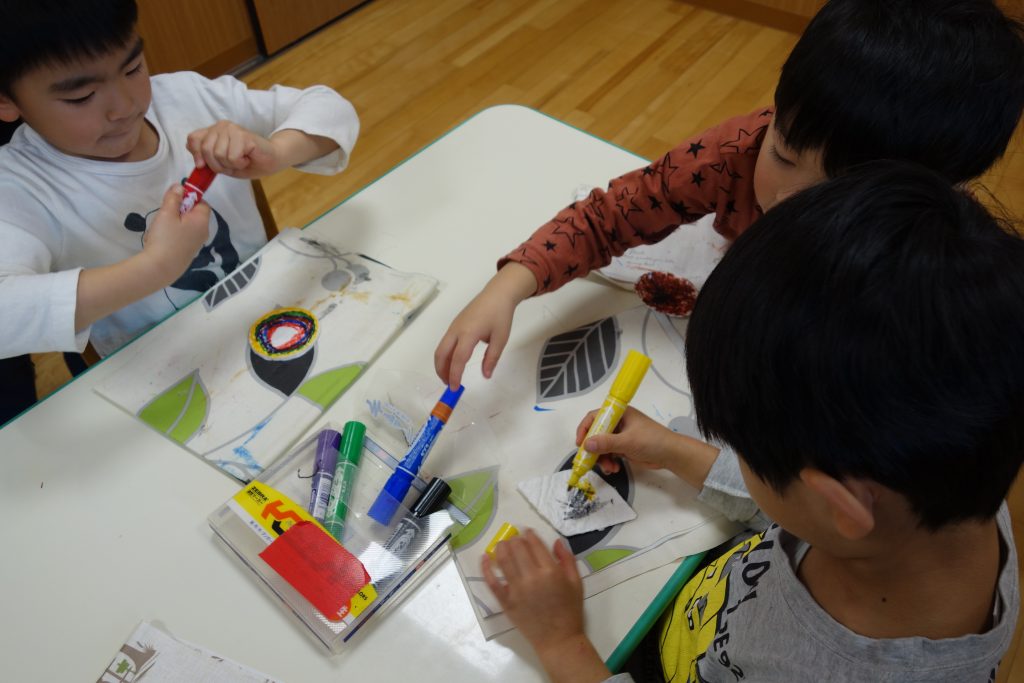 乾燥させたら、好きな絵や模様を描いていきます。実はこれ、来年度の新しいお友だちへの秘密のプレゼント!そのため、何が出来上がるかは今回は秘密にしておきますね!