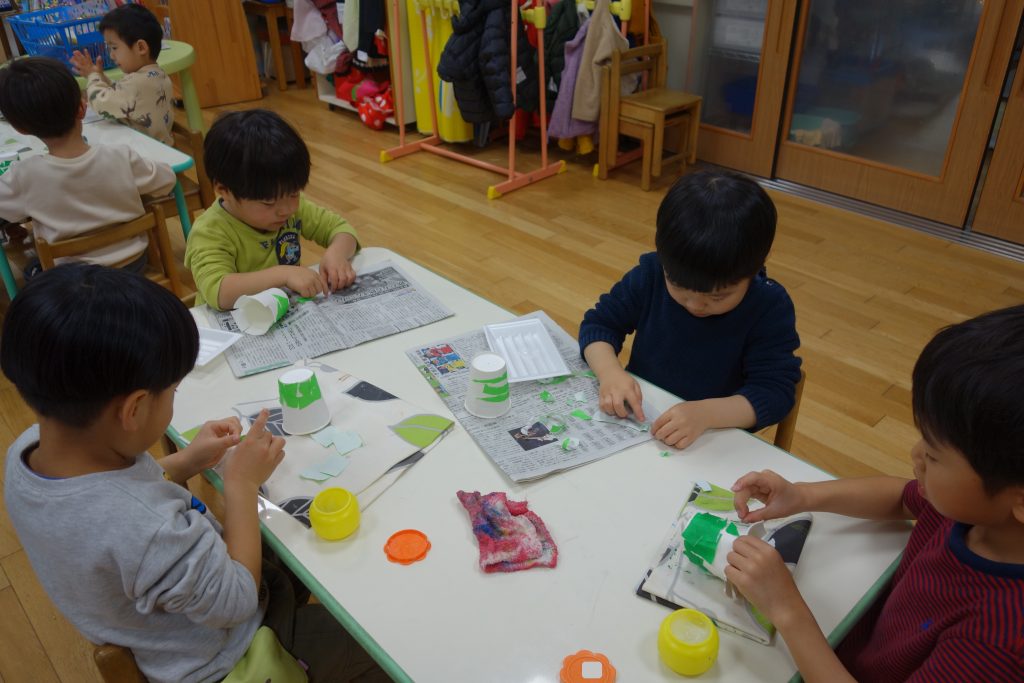帽子にどれくらい花びらがキャッチ出来るかを競争しました。意外と難しく、苦戦している子もいましたが、子供たちは時折強めに吹く風と、舞う花びらの様子に大興奮。春らしいひと時を過ごしました。