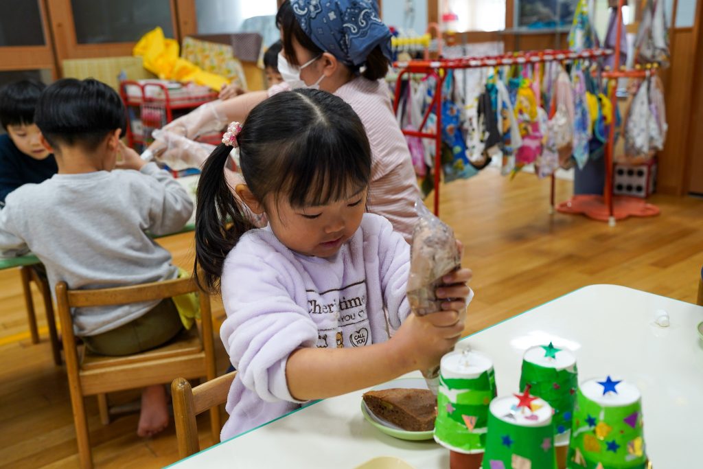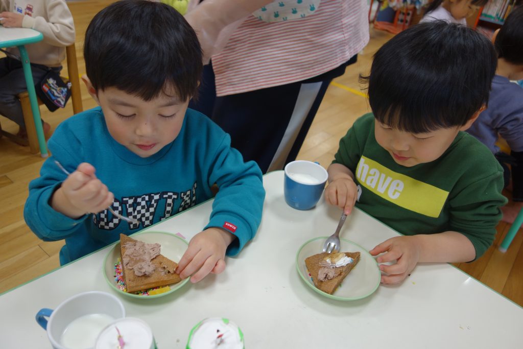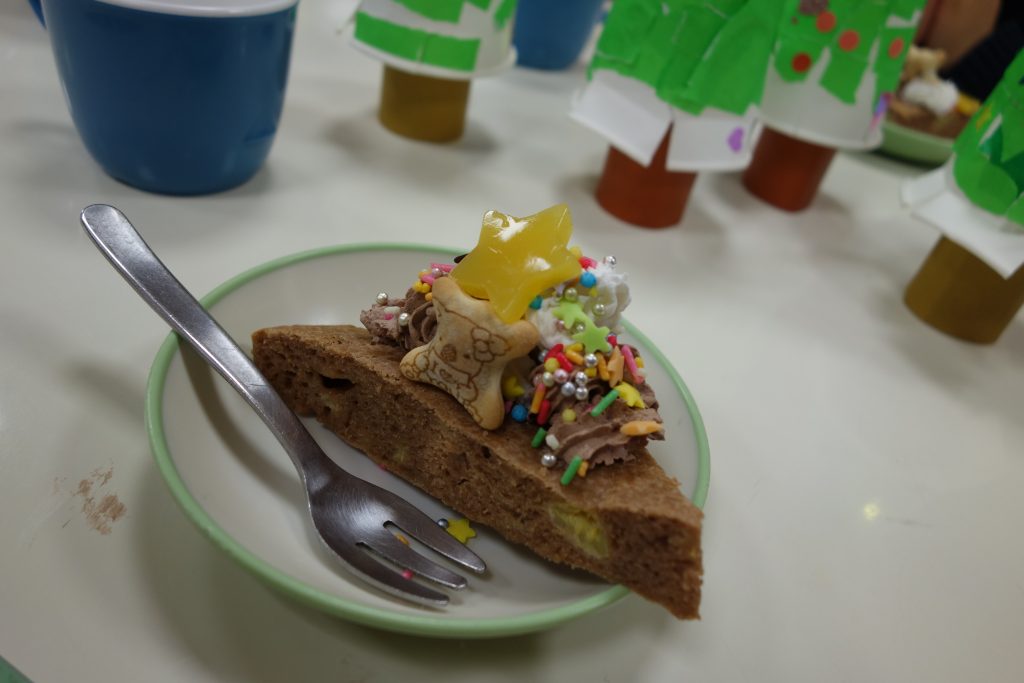 おやつはケーキに自分たちでクリームやアラザンなどで飾り付け!