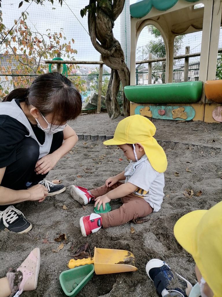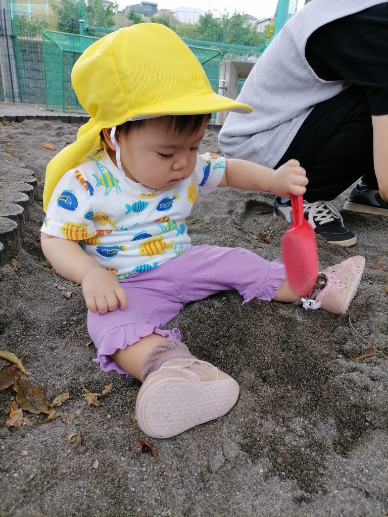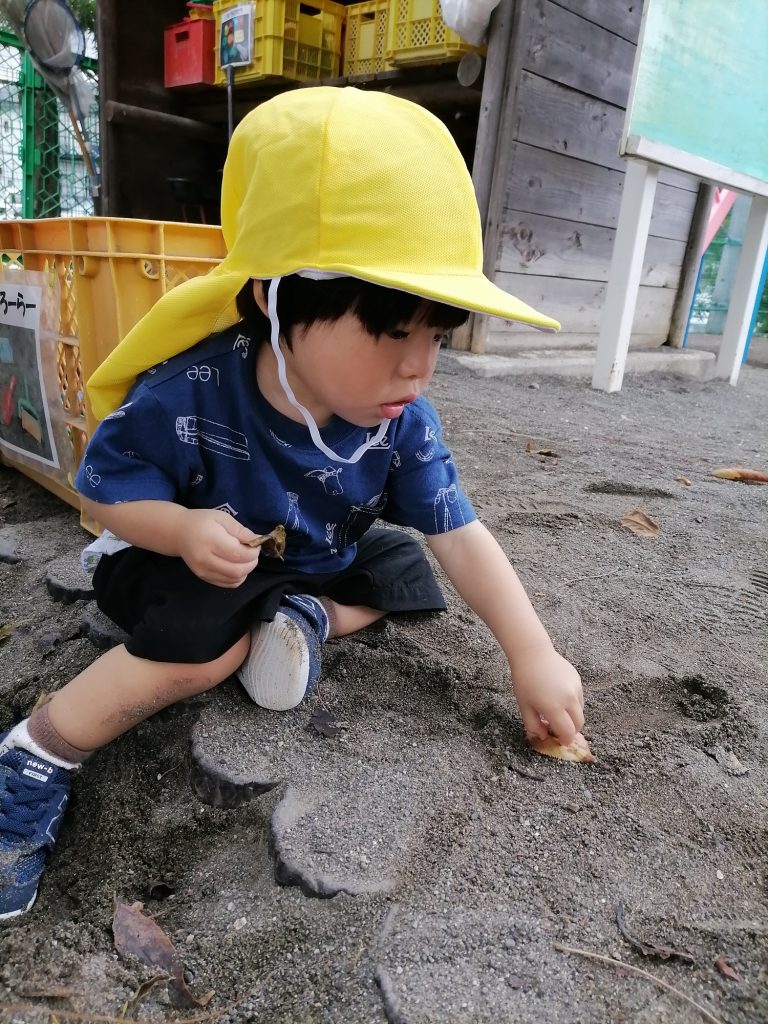 砂遊びよりも落ち葉に興味津々の子の姿も見られていますよ(^^)