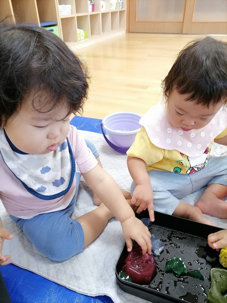保育教諭の手に乗せたスライムに手を伸ばし、