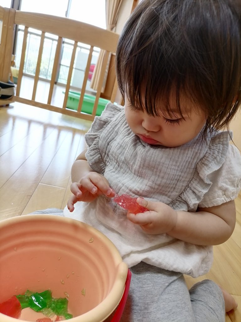 カプセルトイの容器やジョウロから水が出てくる様子、ホースから水が出てくる様子を楽しみたくさん触れています(^^)♪