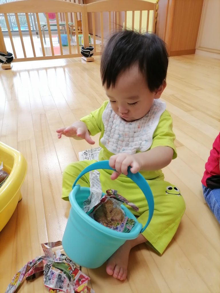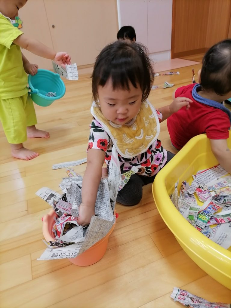 小さなバケツを渡すと、新聞を集めて入れたり出したりを楽しみ、