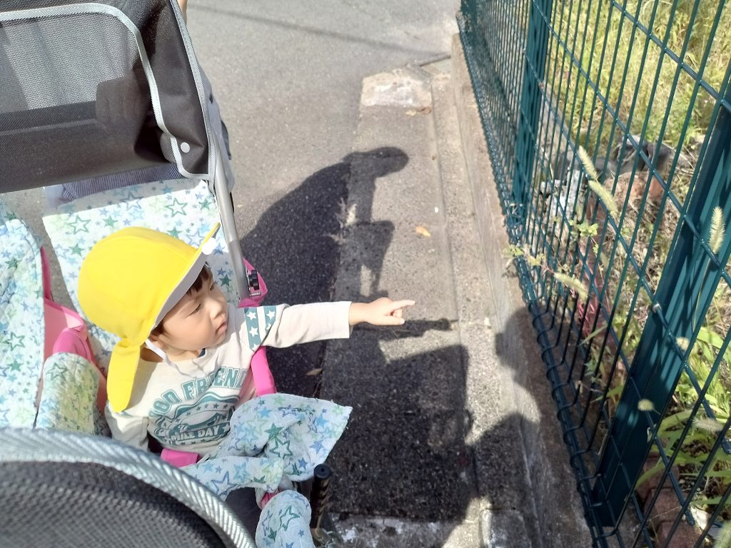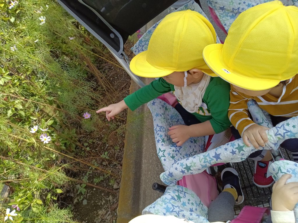 保育教諭が「コスモスが咲いてるよ」「ねこじゃらしがあるよ」などと指差しして伝えると、