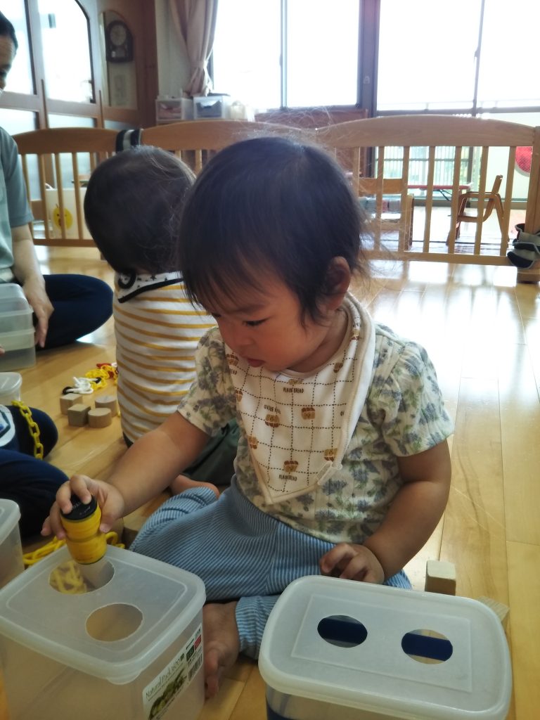 積み重ねるのはバランスを取るのが難しいですが、ひよこグループのお友だちも挑戦しています!