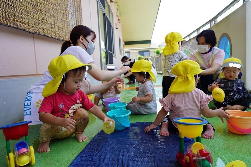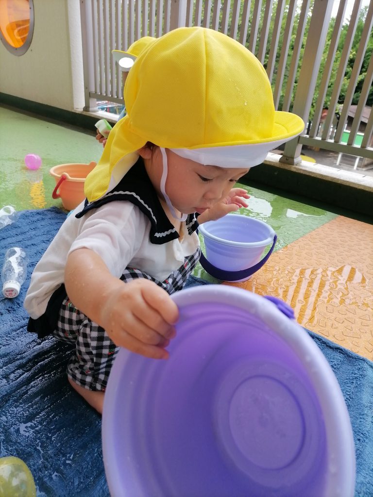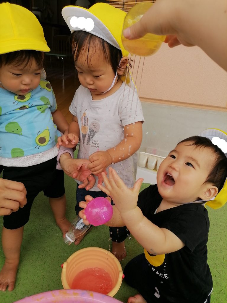 初めは水を怖がる子もいましたが、保育教諭と一緒に遊んだり友だちの様子を見たりすることで水遊びの楽しさを知り、今では全員びしょ濡れになって遊んでいます♪