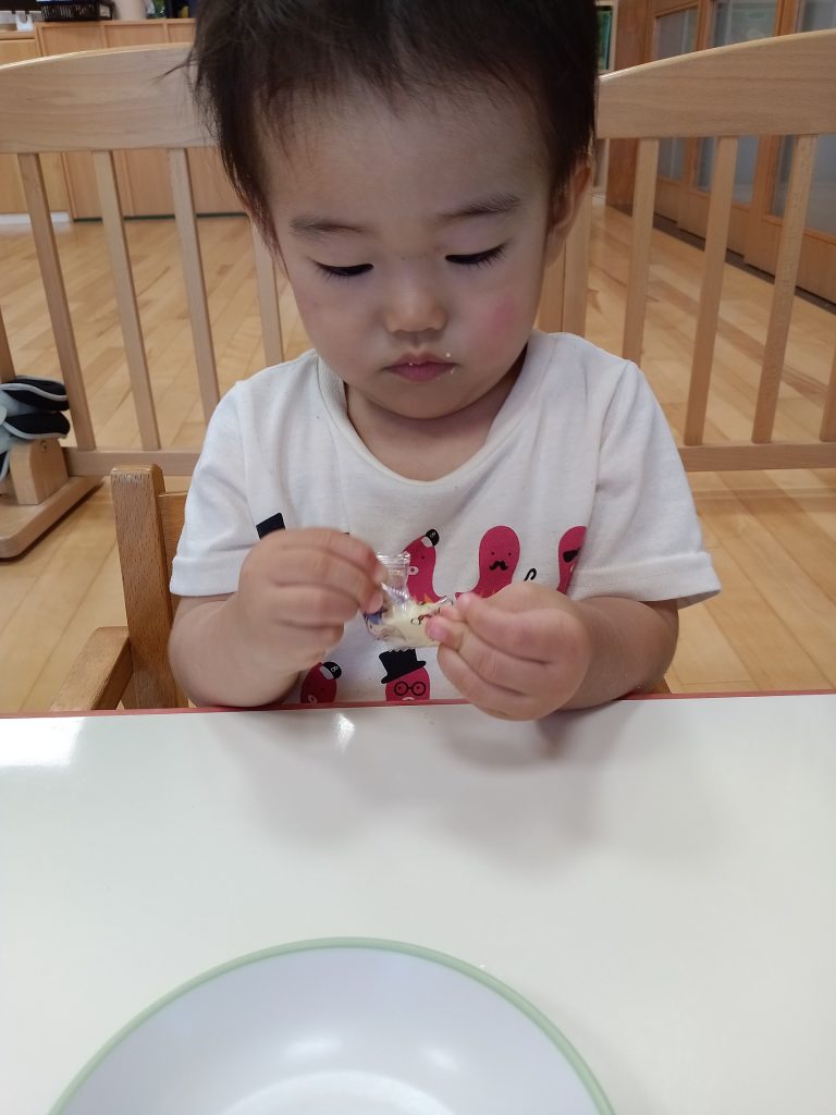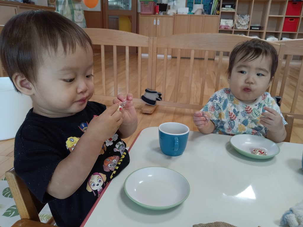 乳児グループは、朝のお集まりをした後に朝おやつ(水分補給)をしています。