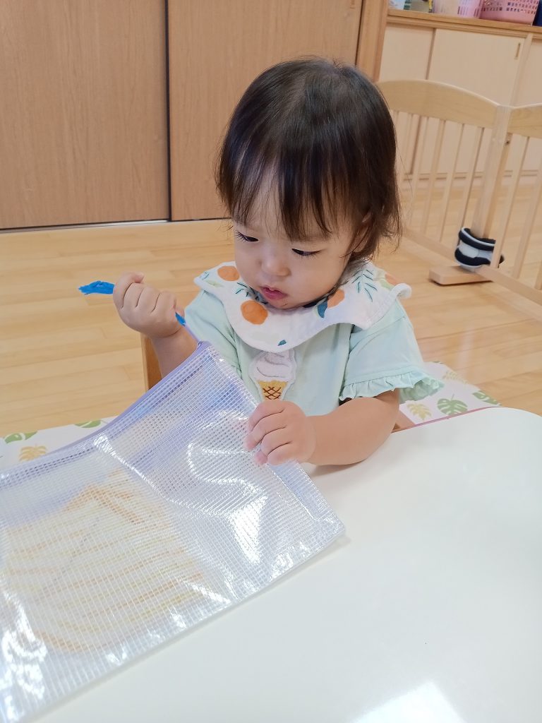 口拭きタオルが入った袋を自分で開けようと、紐を引っ張ります!